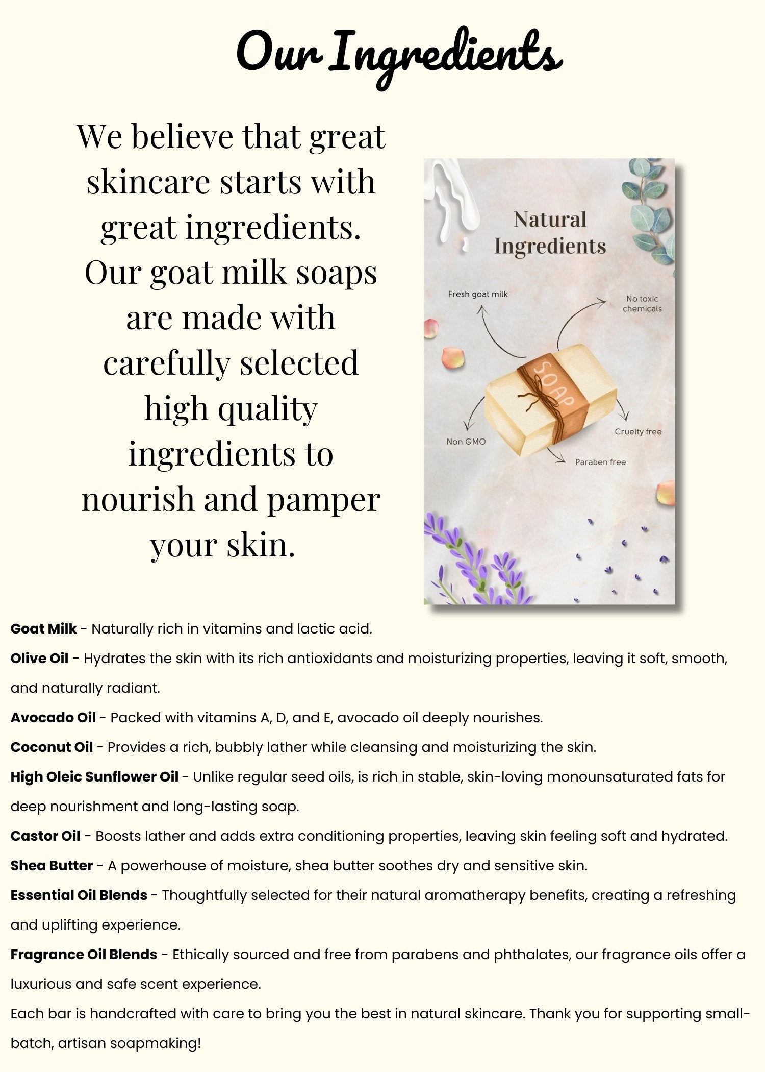 At Udderly Amazing Soapery, nestled in the heart of Oswego, Illinois, we're passionate about crafting premium handcrafted soaps using the freshest goat milk sourced from our own farm. As a family-owned business, we take pride in every step of our soap-making process, from nurturing our goats to meticulously blending ingredients using the cold process method. Each bar is carefully handcrafted in small batches to ensure quality control. We prioritize the well-being of our goats, providing them with a happy and healthy environment to thrive. We believe in transparency, ensuring that every ingredient we use is ethically sourced. Whether you're looking for a gentle cleanser, a soothing moisturizer, or a thoughtful gift for a loved one, our handcrafted products are sure to delight your senses.