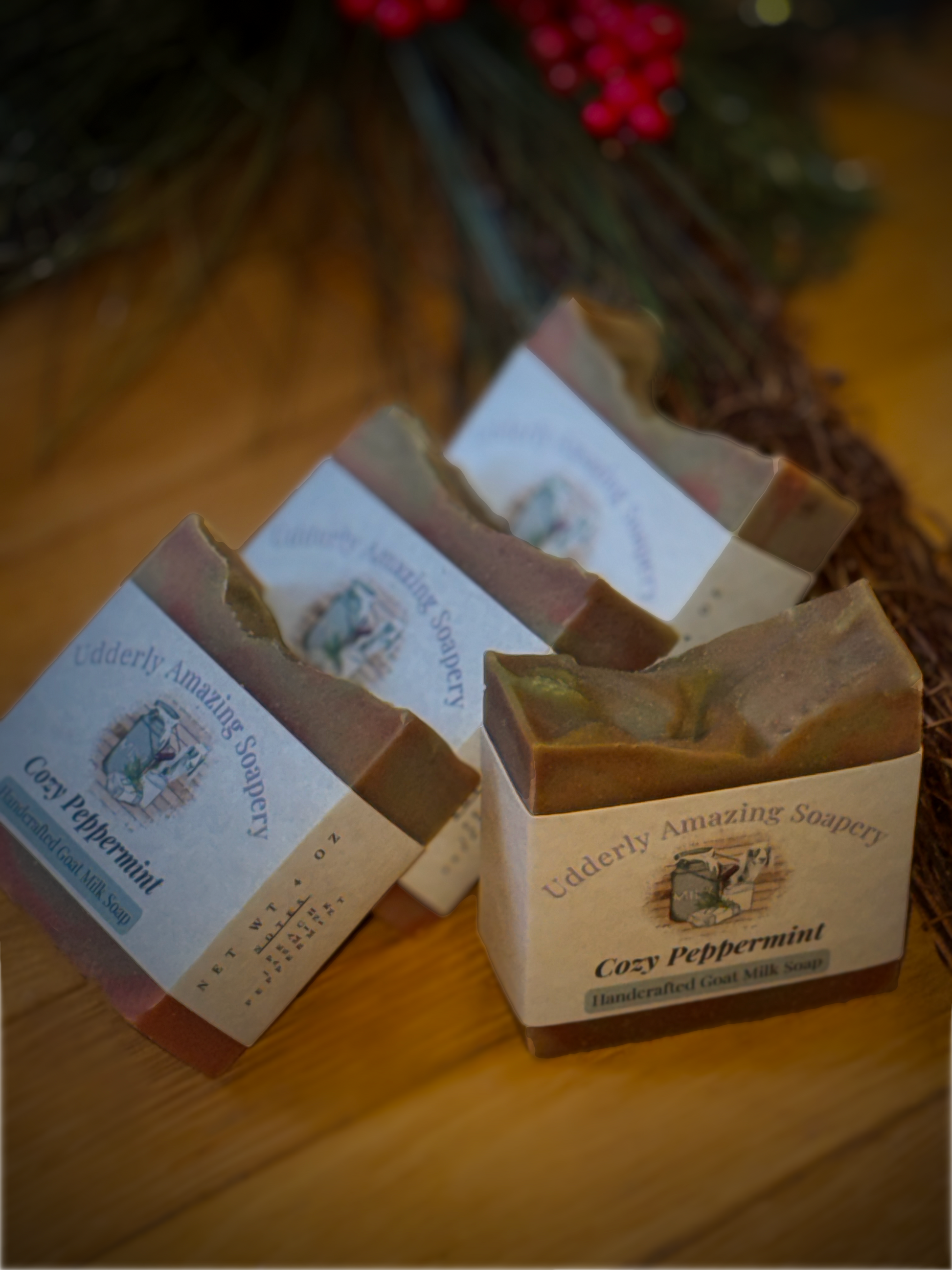 A crisp yet comforting cleanse, our Cozy Peppermint Goat Milk Soap is handcrafted with fresh goat milk and a luxurious blend of oils to capture the perfect balance of fresh mint, soft fruit notes, and a cozy winter sweetness.